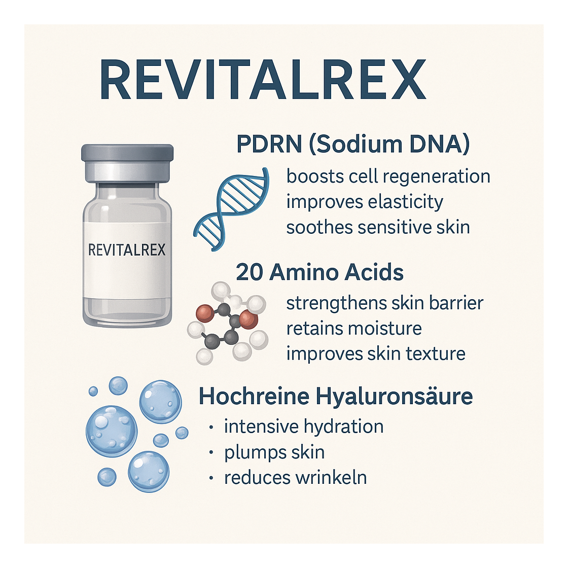 Der REVITALREX Skin Booster enthält 20 essenzielle und nicht-essenzielle Aminosäuren, die die Hautbarriere intensiv unterstützen. Aminosäuren sind unverzichtbare Bausteine der Haut und sorgen für eine optimale Feuchtigkeitsbindung, Regeneration und Schutzfunktion.